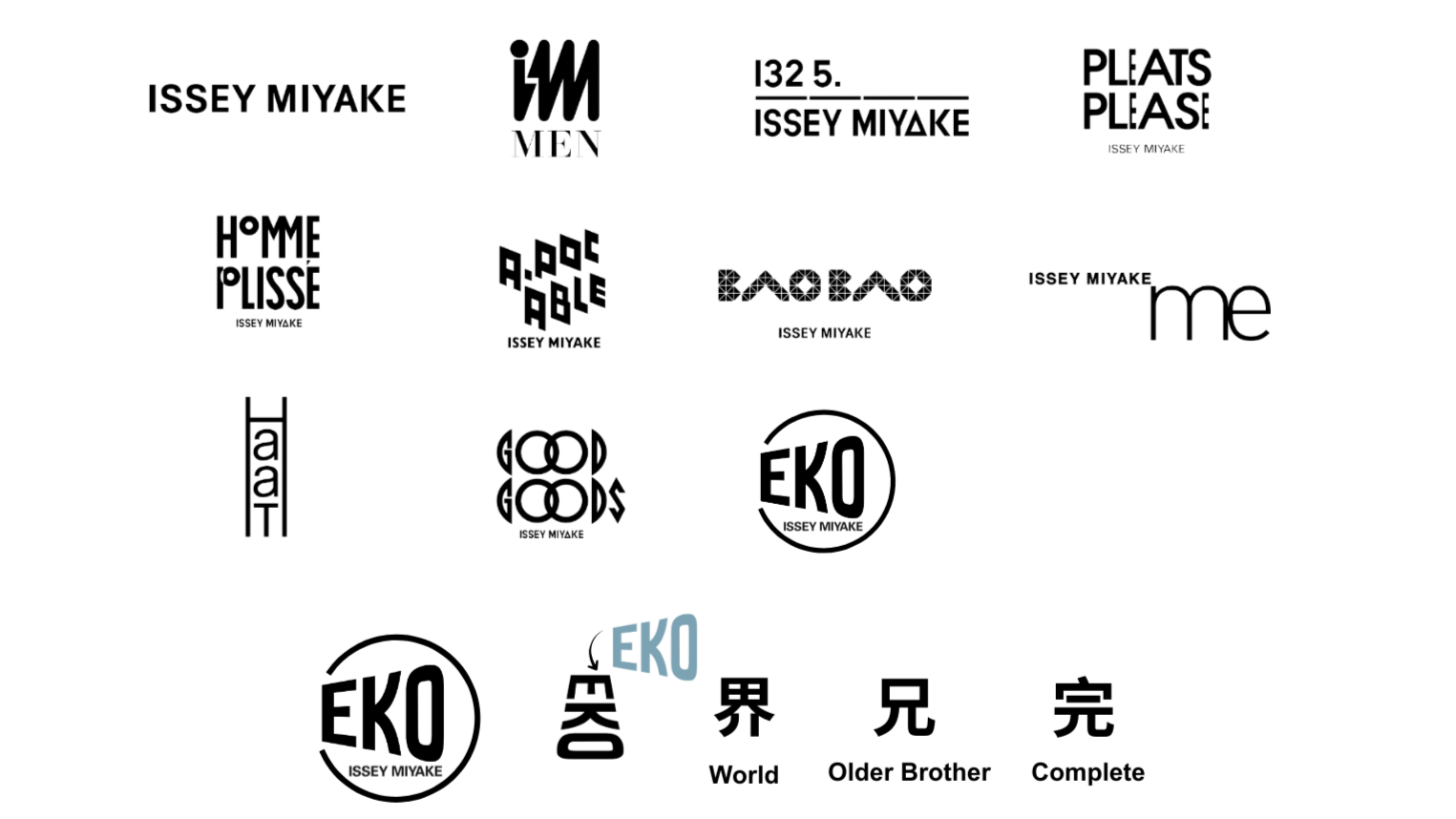 I developed a visually compelling logo and brand concept that embodies circularity, innovation, and movement. I conducted extensive research on typography, shapes, and cross-cultural considerations, including English and Japanese language nuances. The brand name, EKO, not only references “eco” in Japanese but also aligns with kanji meanings for “world,” “older brother,” and “complete” when rotated, reinforcing the brand’s holistic and culturally aware positioning. Visual identity decisions were informed by Issey Miyake’s legacy, signature color palettes, and historical projects to ensure authenticity, alignment with brand heritage, and resonance in both local and global markets.